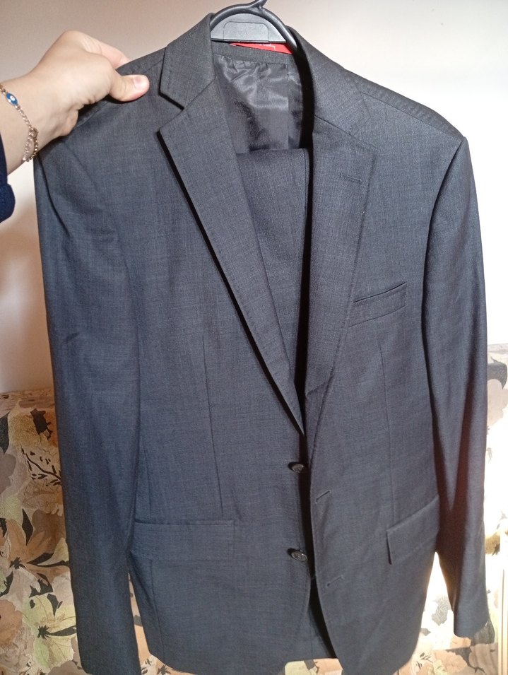 Gri renkte, düğmeli ve klasik kesimde erkek takım elbise. Uzun kollu ve normal kesim, ofis için uygun şık bir parça. ️