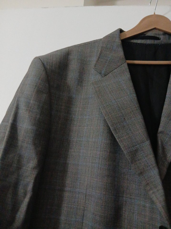 Notch yakalı, düğmeli gri erkek takım elbise. Normal uzunlukta, klasik ve çağdaş tarzda, iş ortamları için uygundur.
