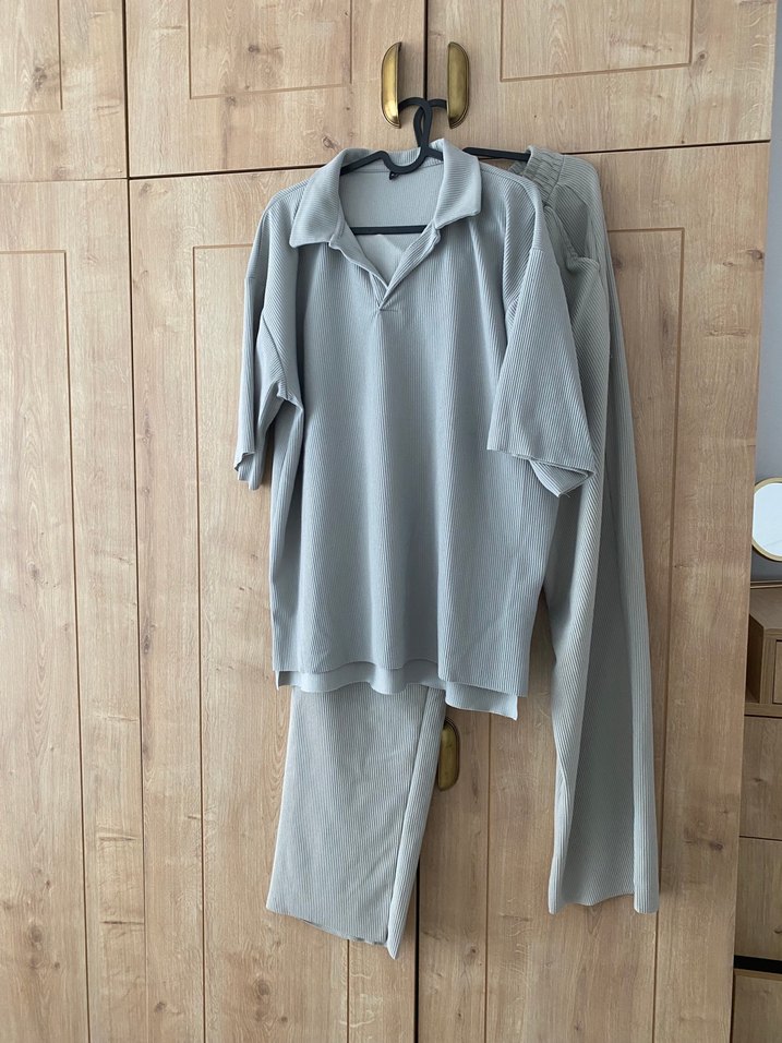 Gri renkte, uzun kollu ve yakalı erkek takımı. Rahat kesim ve midi boy pantolonuyla gündelik şıklık sunar.