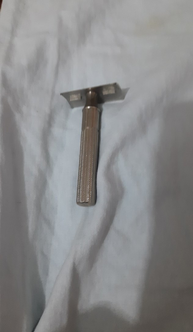 Gri renkli, dokulu sapı ile güvenli tutuş sağlayan klasik tasarımlı erkek tıraş makinesi. Hiç kullanılmamış yeni.