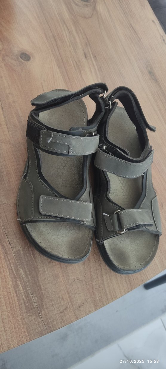 Gri renkte, tokalı kayışlara sahip kauçuk malzemeden yapılmış erkek sandaletleri. Günlük kullanım için rahat ve minimalist sokak stili.