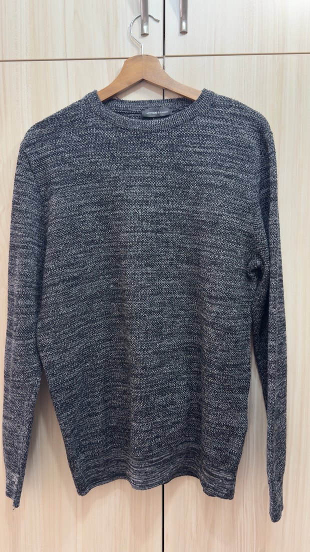 Gri renkli, bisiklet yaka ve uzun kollu, örme dokulu erkek kazak. Rahat kesim ve normal boyda, yumuşak sentetik kumaştan, günlük sokak stiline uygun.