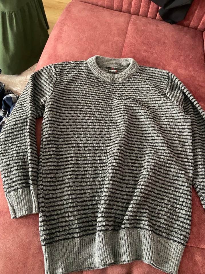 Gri renkte, uzun kollu, yuvarlak yakalı, bol kesim örme erkek kazak. Günlük kullanıma ve sokak stiline uygun, rahat bir parça.