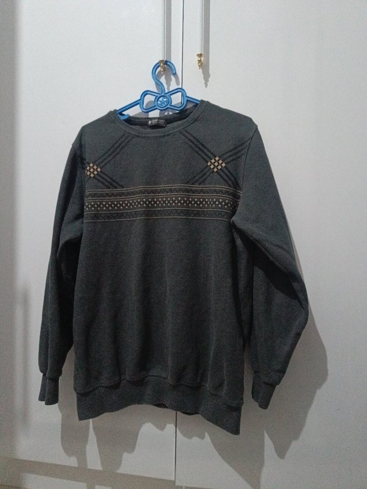 Gri renkli, uzun kollu ve yuvarlak yakalı erkek triko sweatshirt. Salaş kesimi ve göğüs kısmındaki sade desenlerle günlük kullanıma uygun.