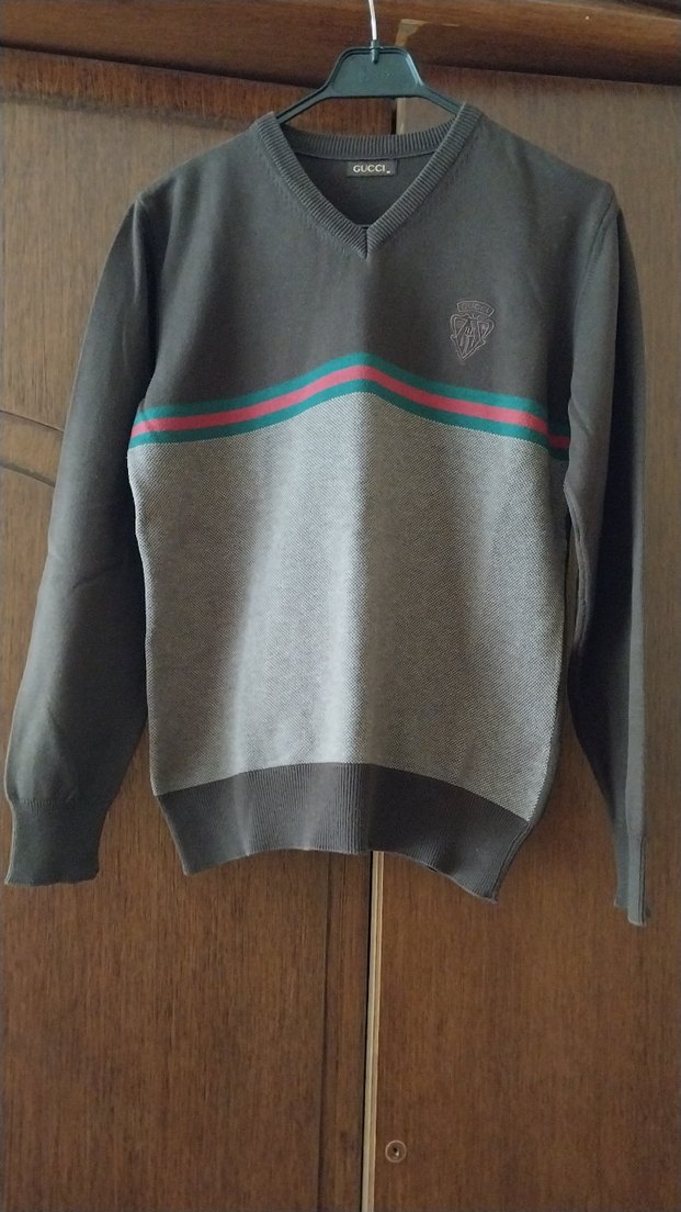 Gri renkli, uzun kollu, yuvarlak yaka erkek triko sweatshirt. Rahat kesimli ve baskılı desene sahip, günlük kullanım için uygun.