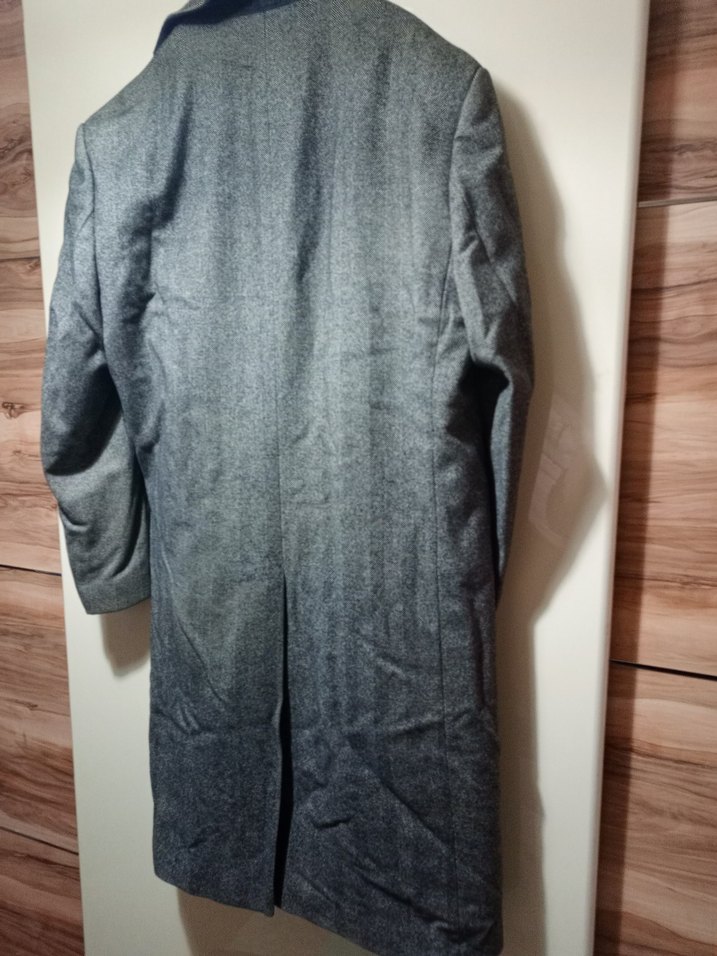 Gri renkli, uzun kesim, düğmeli erkek kaban Notch yaka ve uzun kollu, sentetik kumaştan yapılmıştır. Ofis kullanımı için uygundur.boyu 109 cm en 61 cm dir