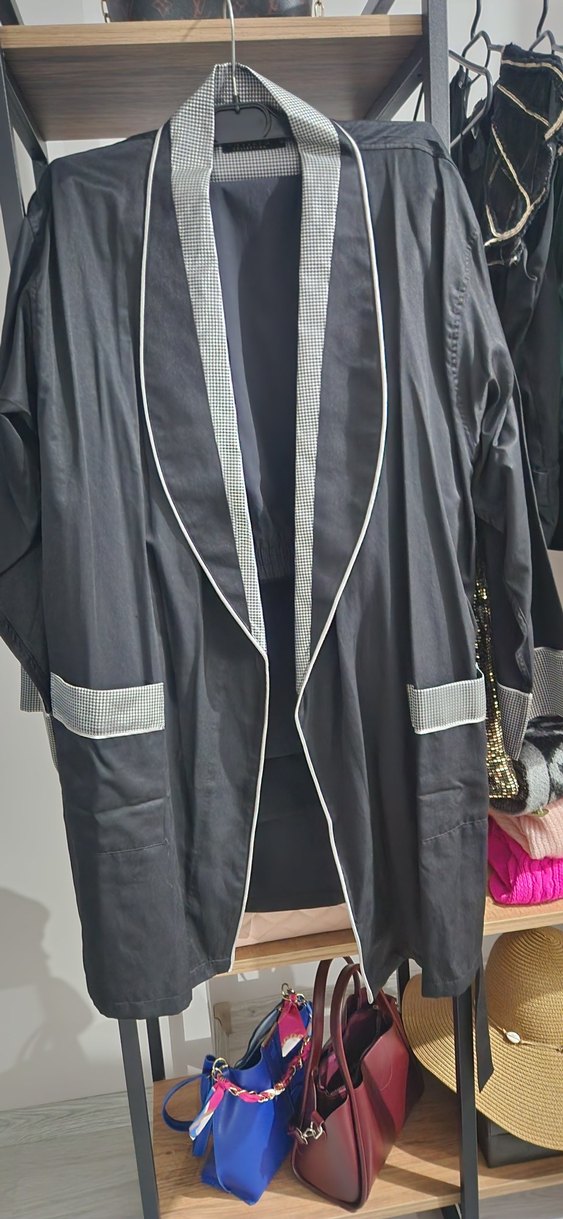 Gri renkte, uzun kollu ve regular fit kadın sabahlık. Yakalarında ve ceplerinde kontrastlı kareli detaylar var. Paris sokak modasına uygun şık bir parça.