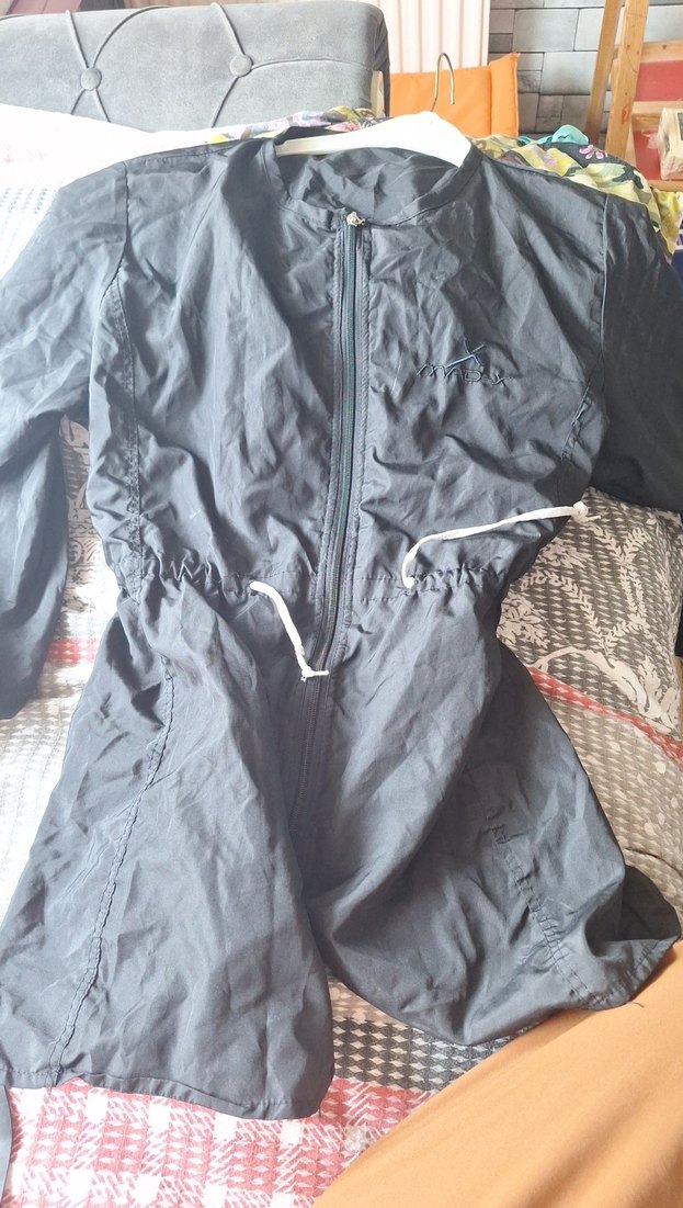 siyah renkli, keten kumaştan yapılmış, uzun kollu ve fermuarlı, yüksek yakalı, normal midi boyda.