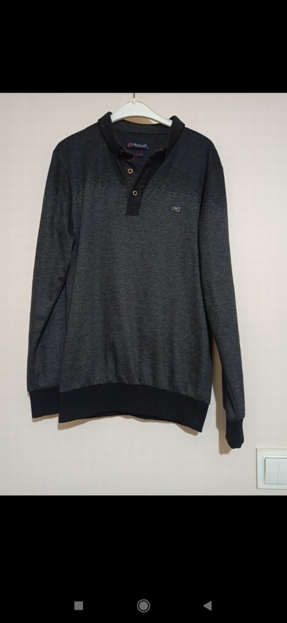 Gri renkte, düğmeli ve uzun kollu, rahat kesim erkek kazak. Sentetik kumaştan, günlük kullanım için uygun.