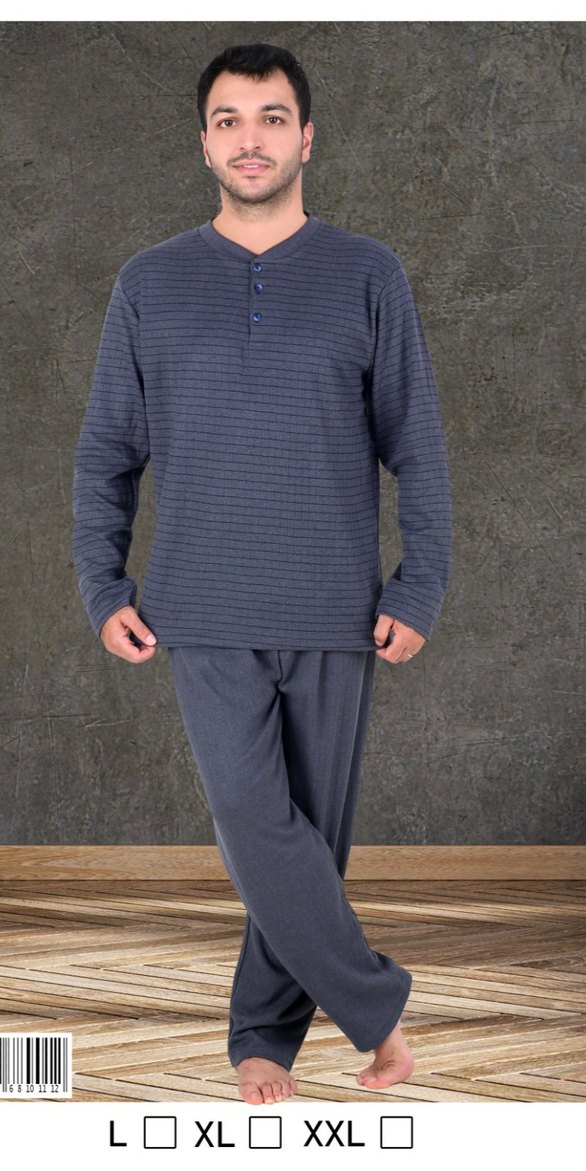 Gri renk, uzun kollu, yuvarlak yakalı, rahat kesim erkek pijama takımı. Desensiz ve gündelik şıklık sunar. bedenler mevcutur