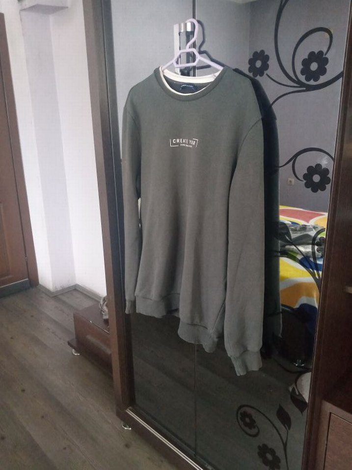 Gri renkli, uzun kollu, bisiklet yaka ve bol kesim erkek sweatshirtü. Yumuşak ve sıcak kumaştan üretilmiş, rahat ve şık bir günlük kıyafet.