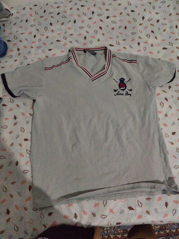 Gri renkli, pamuklu, loose fit kesim erkek tişörtü. Kısa kollu, V yakalı, baskılı ve düğmeli detaylara sahiptir. Trend sokak stili için uygundur.