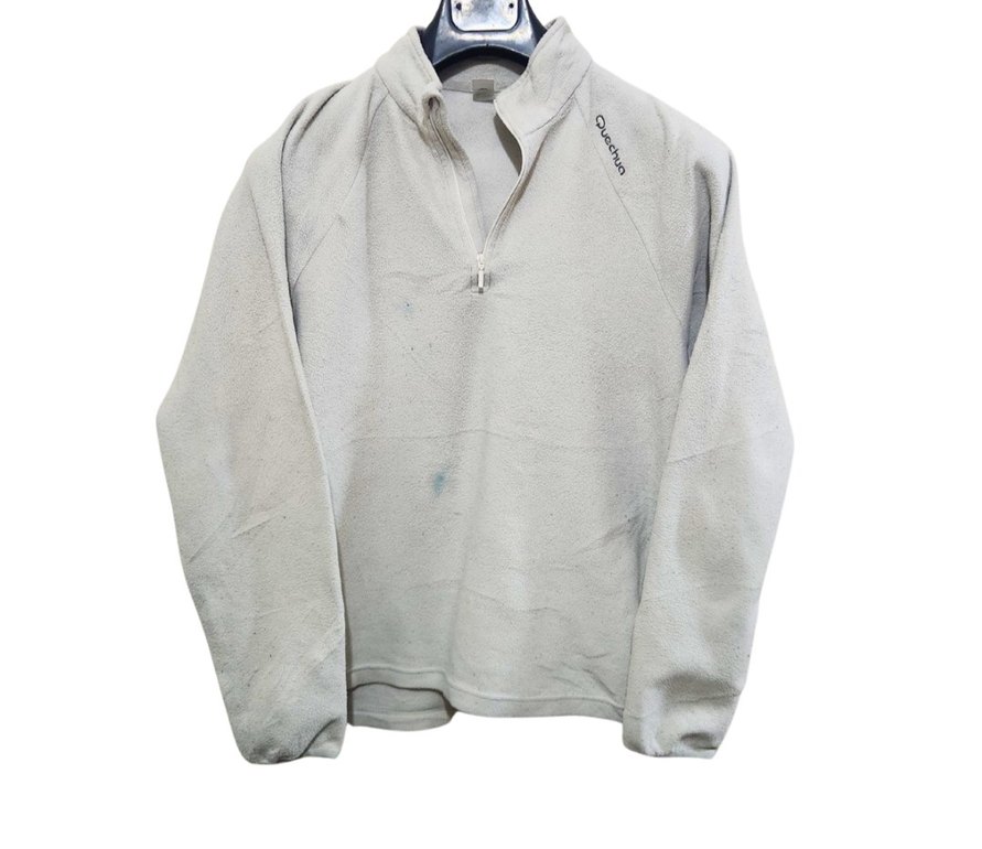 Gri renkli, yarım fermuarlı, uzun kollu ve yuvarlak yakalı erkek polar sweatshirt. Rahat ve bol kesimi günlük sokak stiline uygundur. 70×53 ürünün ön tarafında mavi lekesi vardır görselde belirtilmiştir