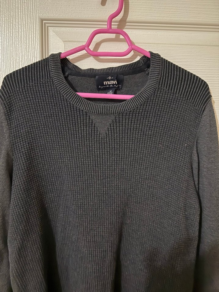 Gri renkte, ince örgü dokulu, yün kumaştan yapılmış, bisiklet yaka ve uzun kollu, normal boyda, fit kesim erkek kazak. Günlük kullanıma uygundur.