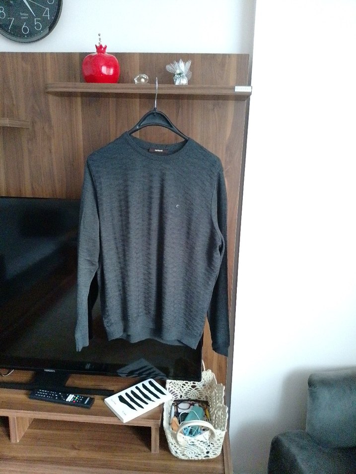 Gri renkli, yuvarlak yaka ve uzun kollu erkek kazak. Yumuşak yünden örülmüş, rahat kesimli, günlük sokak tarzı için uygun.