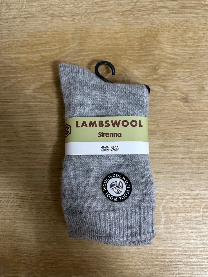 Yumuşak kuzu yünü kumaştan yapılmış, gri renkli, normal boy ve dar kesim erkek çorabı. Marka: Strenna.