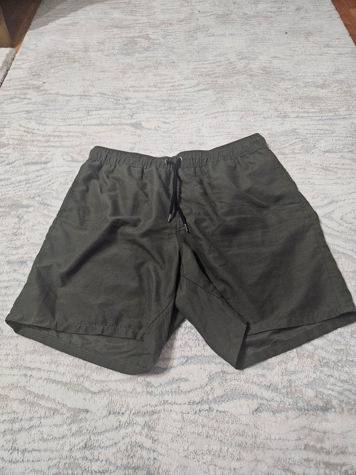 Gri renkte, erkekler için bol kesim mini yüzme şortu. Dış mekan ve athleisure tarzına uygun sade ve desensiz, bağcıklı bel detaylı. Asos M