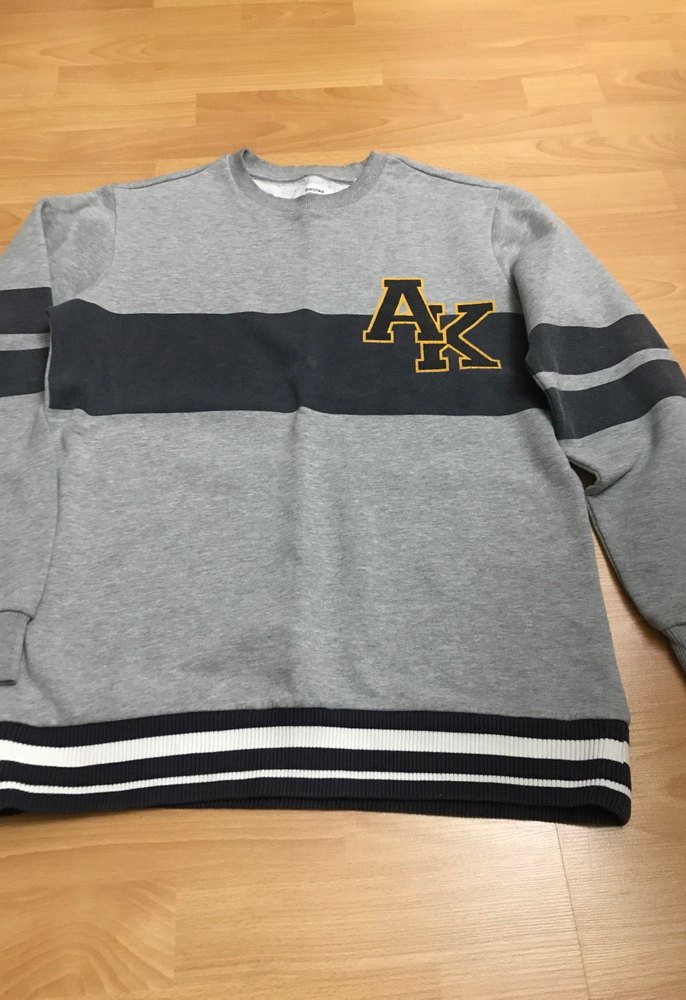 Gri bisiklet yaka, uzun kollu, bol kesim ve örgü detaylı sweatshirt. Üzerinde baskılı AK logosu ve şerit desenler bulunur.