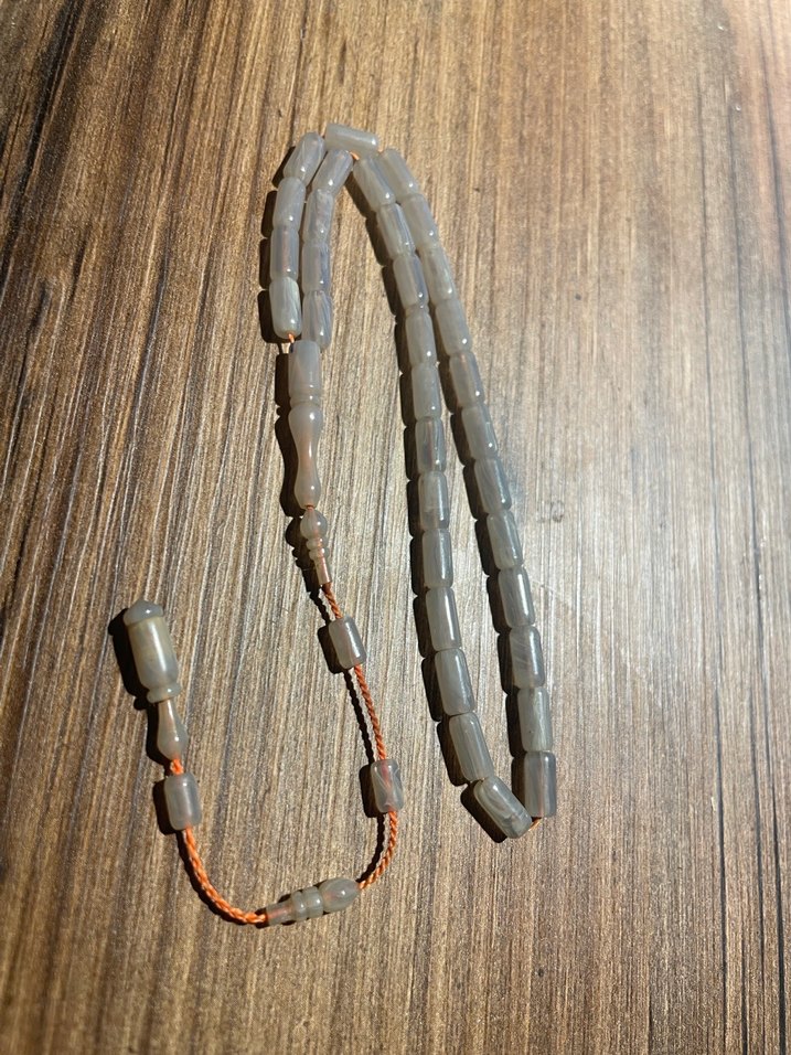 Gri dikdörtgen boncuklardan oluşan, turuncu ipli, bohem tarzda minimalist erkek tesbih. Boncuklar parlak ve pürüzsüzdür.