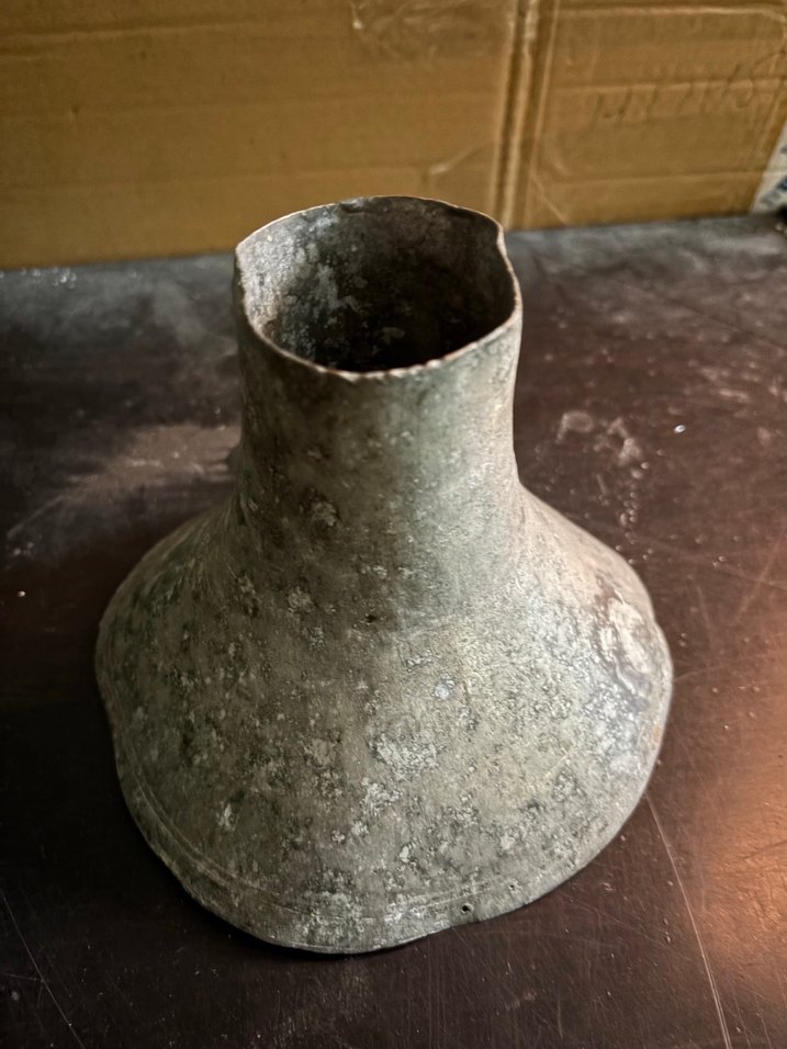 Dokulu yüzeye ve dar boyuna sahip gri eski metal vazo. Aşınmış görünümü ürüne karakter katıyor. Dekoratif kullanım için uygundur.Maddesi bakırdır.