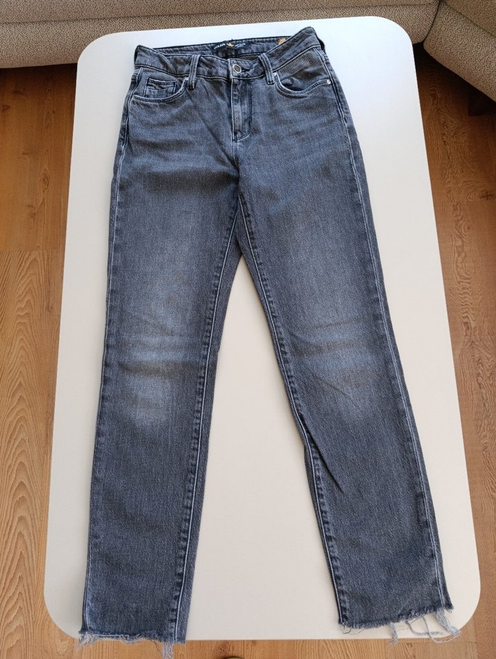Gri renkte, normal boy ve midi stilinde kadın denim pantolon. Rahat kesimi ve sade tasarımıyla günlük kullanıma uygundur.