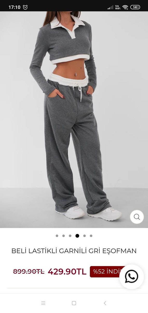 Gri renkli, bel lastikli ve garnili rahat kesim eşofmandır. Bana uzun geldiği için giymedim etiketli duruyor sıfır çok şık eşofman kaliteli tok kumaş eşofman