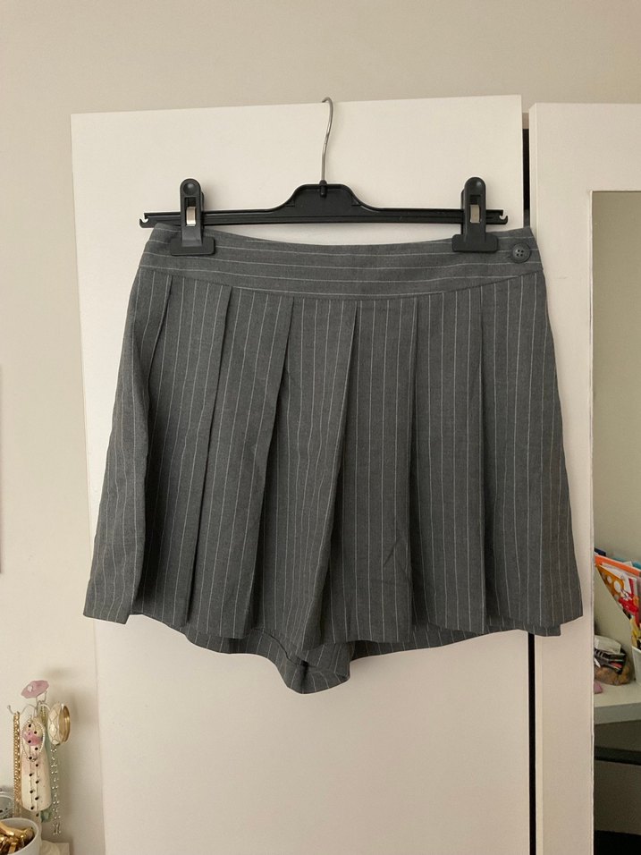 Gri renkli, çizgili desenli pilili ve bol kesim mini etek. Ürün yenidir bana büyük geldiği için hiç giyemedim temizdir. Önden şort kısmı gözükmemektedir.