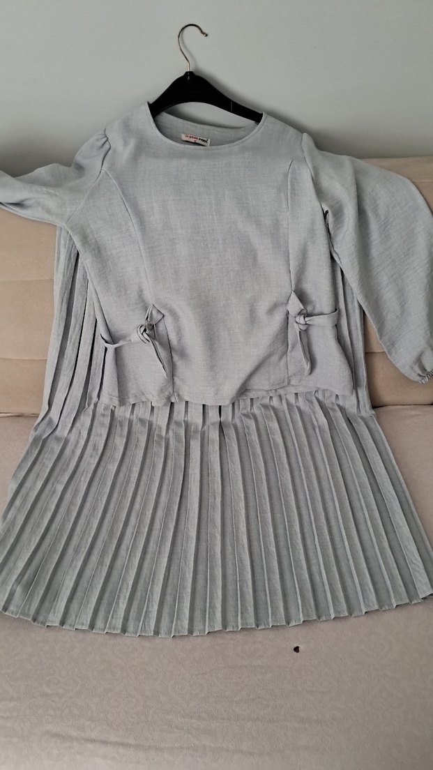 Gri renkte, uzun kollu, yuvarlak yaka ve pilili detaylara sahip bol kesim etekli takım Yumuşak keten kumaştan, günlük kullanım için uygundur.