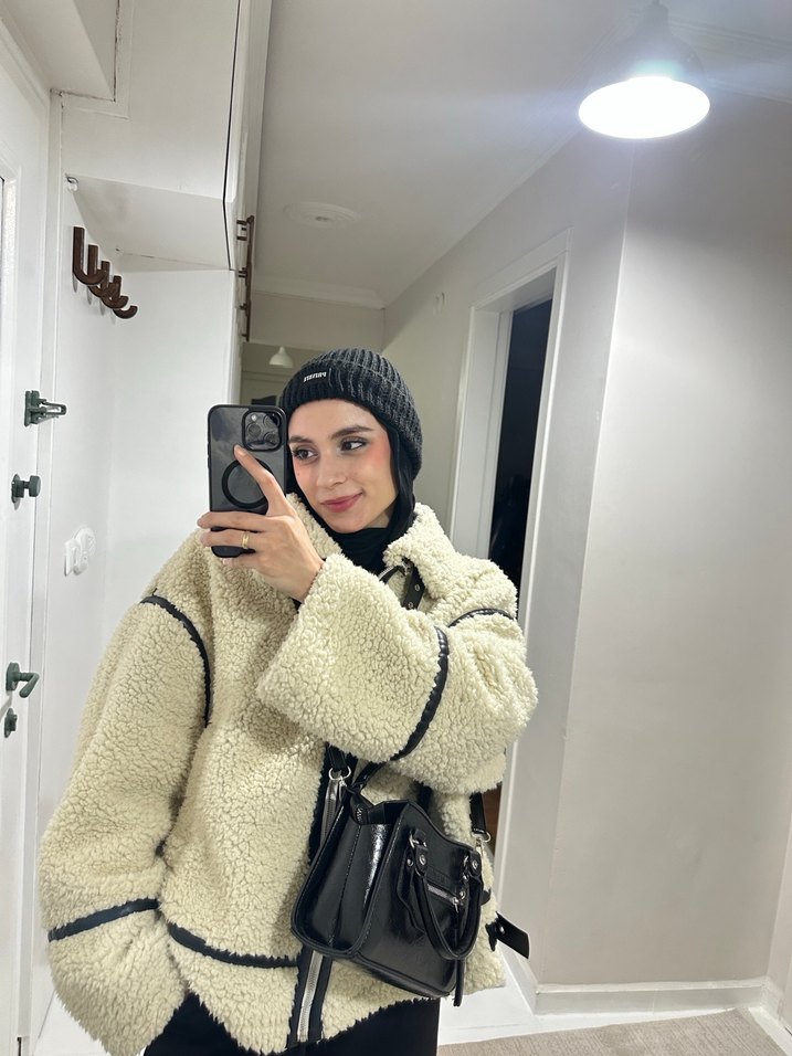 Camel renkli, bol kesim, yüksek yakalı kadın kışlık mont. Gri etnik desenler ve kürk detaylarıyla rahat ve trend sokak stili sunar. Günlük kullanım için idealdir.
