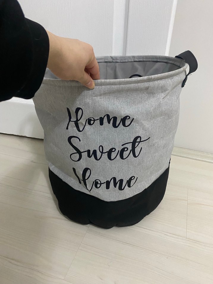 Gri renkte, "Home Sweet Home" yazılı yumuşak kumaştan yapılmış yuvarlak saklama sepeti. Siyah tabanı ve taşıma kulpu bulunur. 1 kez kullanıldı harika bir üründür