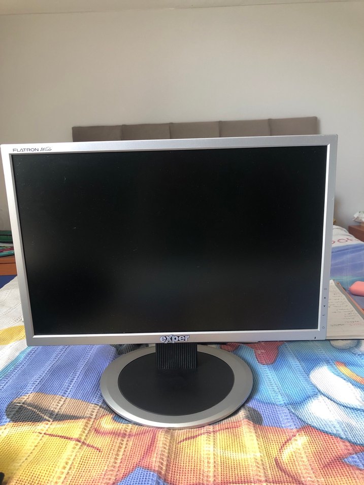 Yuvarlak tabanlı, düz ekranlı gri Exper bilgisayar monitörü. Herhangi bir ekran çiziği problemi yoktur.