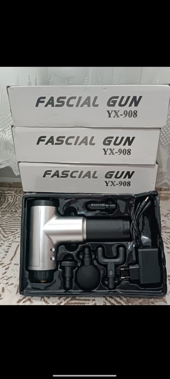 Gri Fasical Gun YX-908, çeşitli masaj başlıkları ve şarj cihazı ile kas rahatlatma için kullanılır.