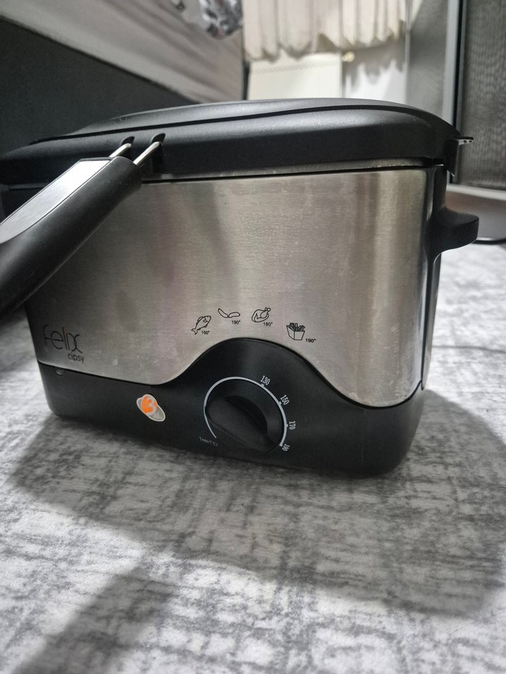 Gri renkli Felix mini fritöz, sıcaklık kontrol düğmesi ve kompakt tasarımıyla çeşitli yiyeceklerin kızartılması için uygundur. Sorunsuz çalışıyor defosu yok