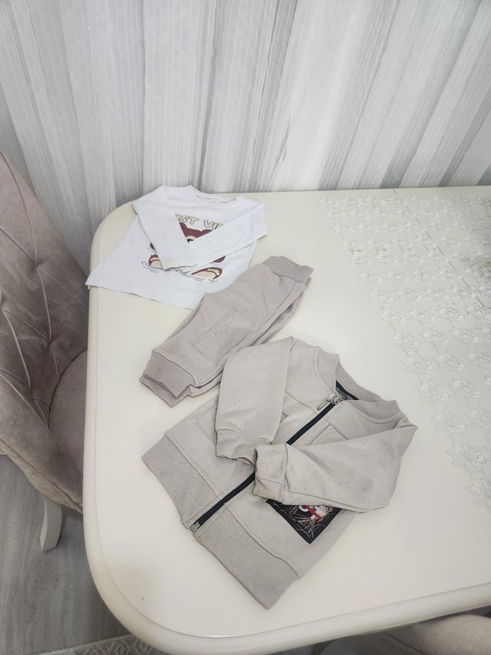 Yumuşak ve sıcak kumaştan, baskılı uzun kollu bisiklet yaka üst ve fermuarlı gri ceket içeren bebek erkek takım.