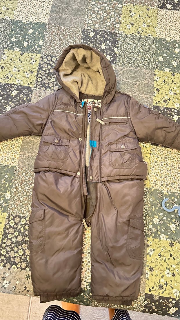 Gri ,fermuarlı ve yumuşak kürklü astarlı bebek erkek kayak tulumu, sokak stili ve düz desende.18 ay