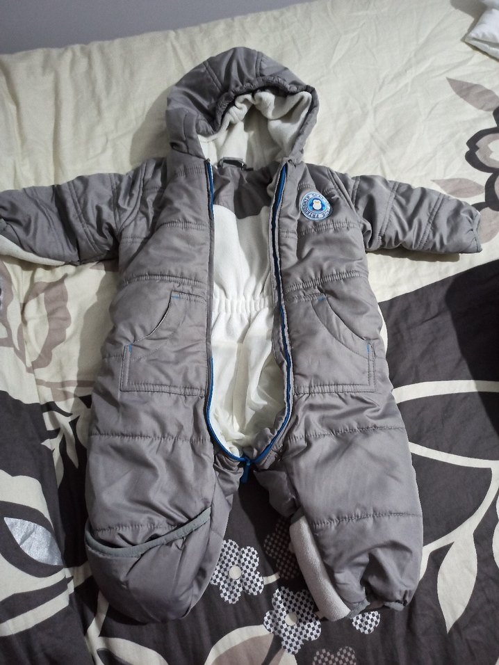 Yumuşak ve sıcak kumaştan, kapüşonlu, fermuarlı gri bebek kayak tulumu, sokak stilinde ve desensizdir. 68 cm , yurtdışı ürünüdür.
