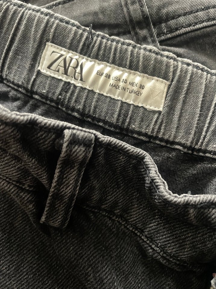 Gri renkte, fermuarlı detaylı, baskılı desenli bol kesim midi uzunluğunda kot pantolon. Zara tarafından Türkiye'de üretilmiştir.