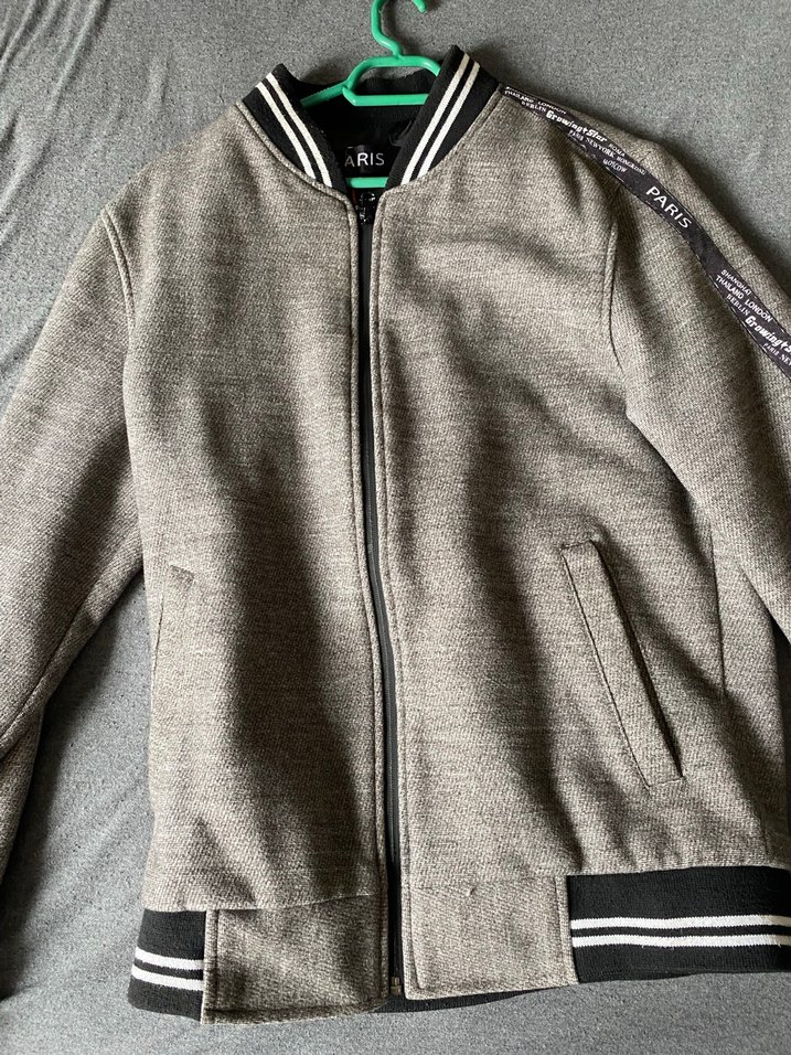Gri renkte, fermuarlı ve normal boyda erkek ceketi. Notch yaka, uzun kollu, sentetik kumaştan, sokak stiline uygun rahat bir tasarım.