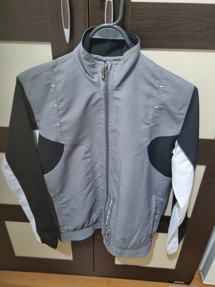 Gri, siyah ve beyaz detaylı sentetik kumaştan yapılmış, yüksek yakalı ve fermuarlı erkek ceket. Normal kesim ve günlük kullanım için uygundur.
