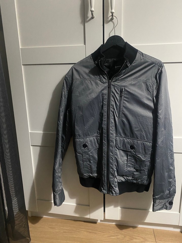 Gri renkte, fermuarlı ve kesik yaka detaylı erkek ceketi. Sentetik kumaştan, normal boy ve regular fit kesime sahip, günlük kullanıma uygun uzun kollu ceket.