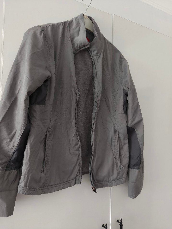 Gri renkli, fermuarlı, yüksek yakalı ve uzun kollu, spor tarzında erkek ceketi. Sentetik kumaştan üretilmiş, günlük dış mekan kullanımı için uygun. Kullanılmış, hasarsız. Biz 12 yaş kullandık.