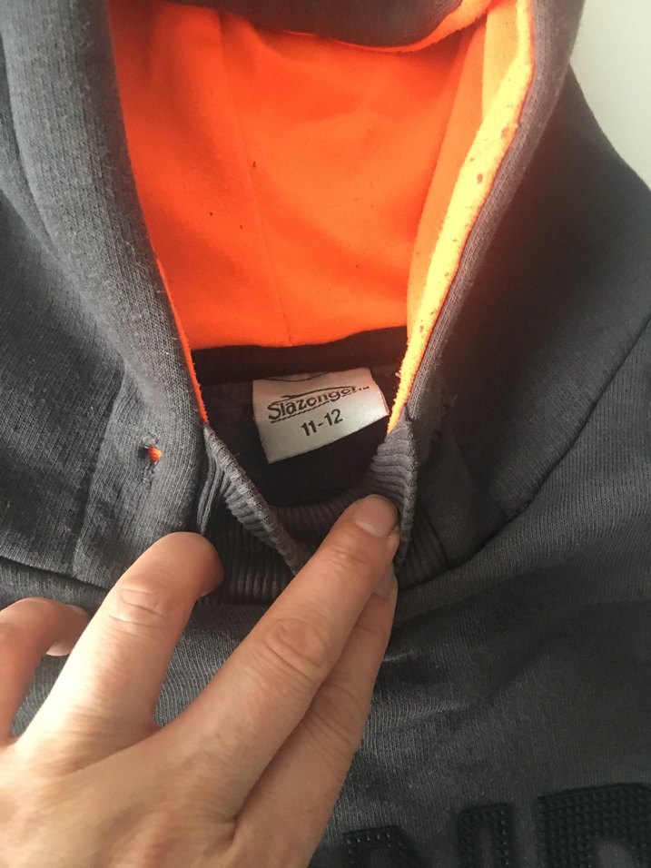 Gri renkli, fermuarlı ve baskılı desenli, yumuşak ve sıcak kumaştan yapılmış, erkek çocuklar için 11-12 yaş arası, dar kesim sweatshirt.