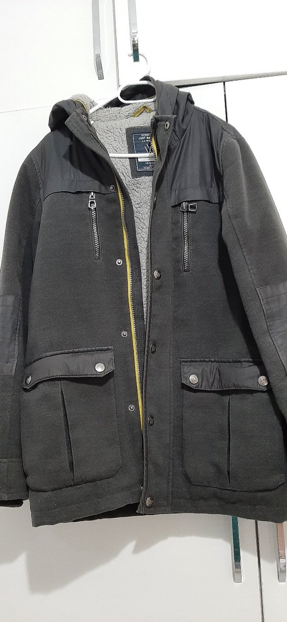 Gri renkli, fermuarlı cepleri olan erkek mont.Kaşe kumaştan, içi peluşlu sıcacık tutan kaban