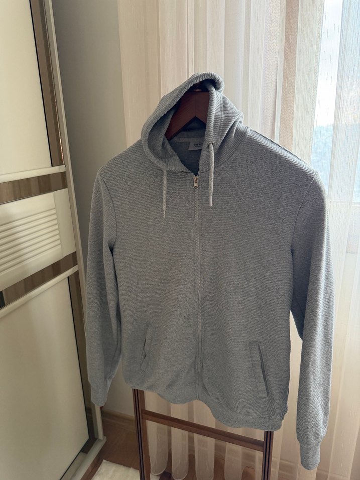 Fermuarlı ve uzun kollu, gri renkli, ince kesim erkek sweatshirt. Yumuşak ve sıcak dokulu kumaştan, günlük sokak stili için uygun.