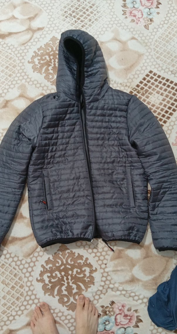 Gri renkte, fermuarlı ve kapüşonlu erkek mont. Uzun kollu, normal boyda ve rahat sokak stili için yumuşak, sıcak dokulu kumaştan üretilmiştir.