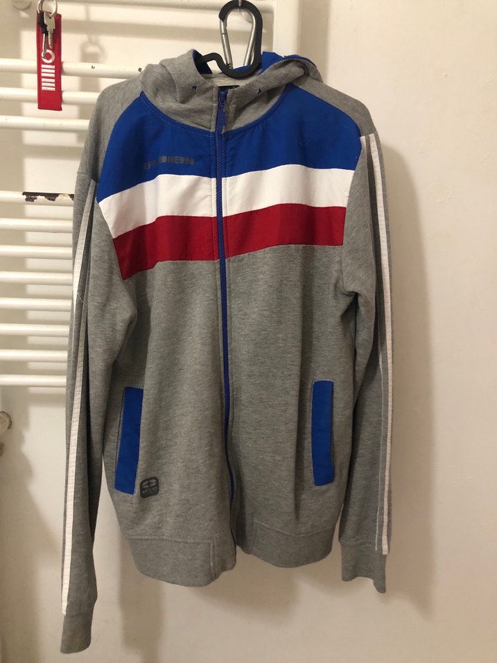 Fermuarlı, uzun kollu ve bisiklet yaka gri erkek sweatshirt. Mavi, beyaz ve kırmızı renk bloklu, spor ve sokak tarzı uyumlu. Kullanımdan dolayı tüylenmeleri var bir yerde de küçük ip çekmeleri var. Fiyatı uygun tuttum.