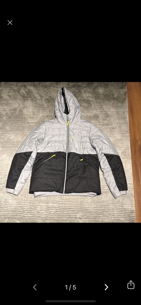 Gri ve siyah tonlarda, yumuşak fleece kumaştan yapılmış, fermuarlı ve yüksek yakalı, uzun kollu, normal boyda erkek kayak montu. Outdoor ve sokak stili için uygun.