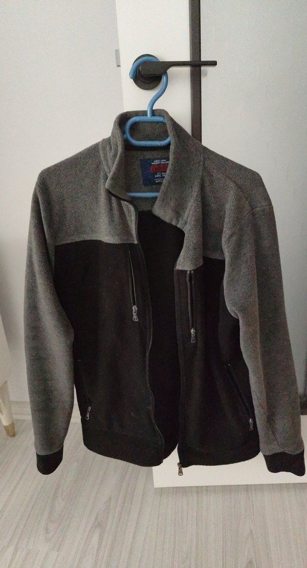 Gri tonlarında, fermuarlı cepli, yüksek yakalı, erkeklere özel fitted kesim polar ceket. fermuarlarları biraz zor kapanıyor başka kusuru yok
