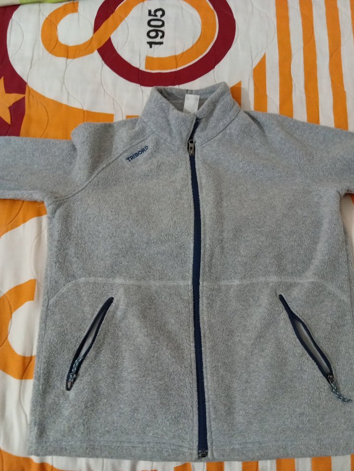 Gri renkte erkek polar sweatshirt, tam ön fermuar ve fermuarlı yan ceplere sahip. Bisiklet yaka, uzun kollu ve günlük kullanım için uygun, normal uzunlukta ve dar kesimdir.