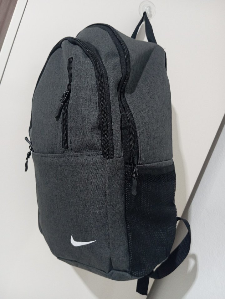 Gri renkli erkek sırt çantası, fermuarlı bölmeleri ve baskılı deseniyle dikkat çeker. Yanında ekstra depolama için file cep bulunur.